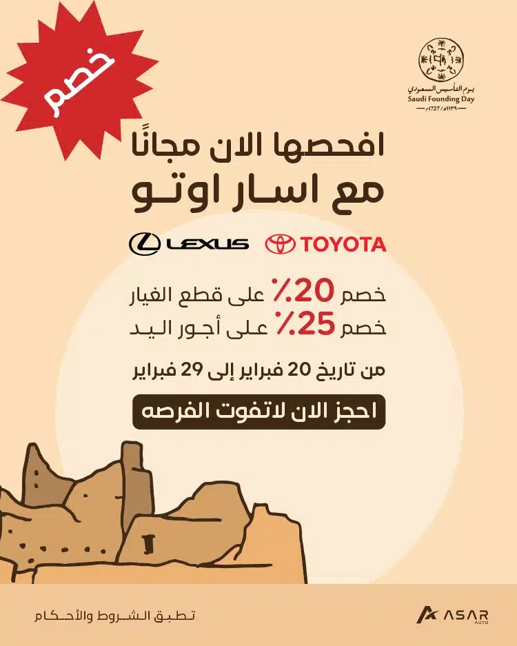 - هذه الباقات صالحة فقط في مركز خدمة ASAR (تويوتا ولكزس) للفترة من 20 فبراير حتى 29 فبراير 2024.